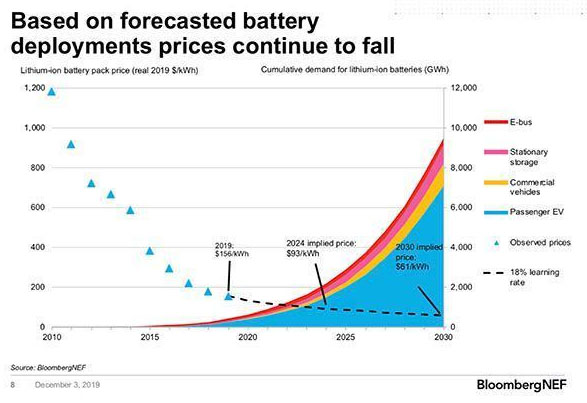 據(jù)預(yù)測(cè),2024年全球鋰離子電池累計(jì)需求量將超過(guò)2億千瓦時(shí),價(jià)格將降至100美元/千瓦時(shí)以下,這個(gè)價(jià)格被認(rèn)為是電動(dòng)車與燃油車實(shí)現(xiàn)購(gòu)置平價(jià)的臨界點(diǎn)。而在2030年,全球鋰電池均價(jià)或?qū)⒌椭?1美元/千瓦時(shí),當(dāng)然這其中還存在諸多變數(shù)。