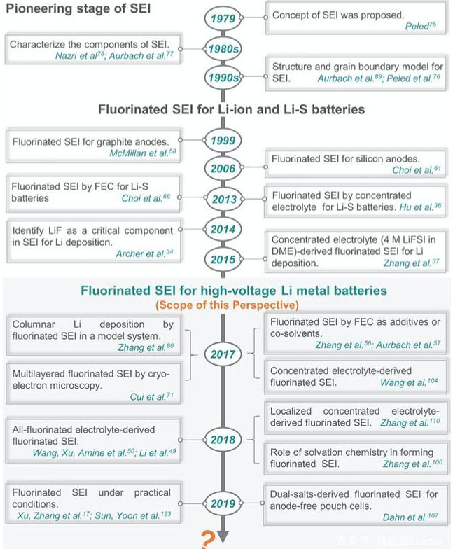 通常氟化SEI膜指的是含LiF較高的SEI膜,氟化SEI膜的研究源自于鋰離子電池。通常在電解液中添加氟化溶劑(如FEC)在負(fù)極表面形成富含LiF的SEI膜,提升鋰離子電池的電化學(xué)性能,這一方法被廣泛的應(yīng)用在硅負(fù)極、鈉離子電池和Li-S電池的研究之中,下圖簡單的總結(jié)了氟化SEI膜的發(fā)展歷史。