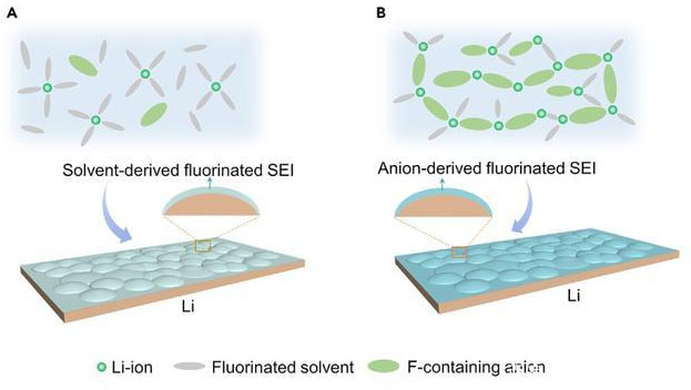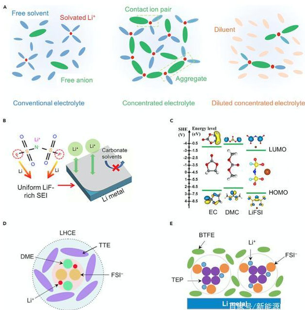 除了電解液中的溶劑能夠發(fā)生分解在負(fù)極表面生成一層富含LiF的SEI膜外,一些含有F元素的陰離子,例如LiTFSI、LiDFOB、LiFSI和LiBF4,也能夠在負(fù)極表面產(chǎn)生氟化的SEI膜。近年來,采用上述鋰鹽的高濃度電解液得到了廣泛的關(guān)注,不同于傳統(tǒng)的電解液,高濃度電解液中的溶劑分子基本上都與離子發(fā)生溶劑化,電解液中幾乎不存在自由溶劑分子,這一特性也賦予了高濃度電解液全新的特性。