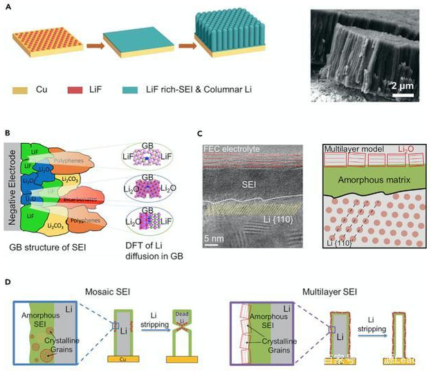 負(fù)極表面的SEI膜主要來自電解液的分解,因此要形成氟化SEI膜,需要在電解液中添加含氟的溶劑或陰離子。LiF是氟化SEI膜中的主要含F(xiàn)成分,LiF能夠幫助Li+在金屬鋰負(fù)極表面沉積成為有序的、排列整齊的圓柱形結(jié)構(gòu)(如下圖a所示)。計算表明,Li+在LiF顆粒晶界處的擴散速度要明顯快于在體相中的擴散速度,因此Li+在LiF/Li2O混合SEI膜中的擴散速度要明顯快于在均勻的LiF或Li2O成分SEI膜中的擴散速度(如下圖b所示),但是由于在實際中SEI膜的成分和結(jié)構(gòu)更為復(fù)雜,因此Li+在SEI膜中的擴散機理還需要進一步的研究。