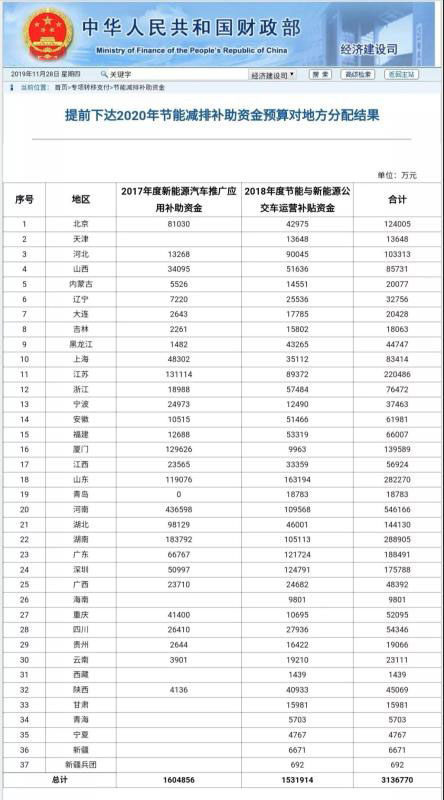 近日,財(cái)政部發(fā)布了《提前下達(dá)2020年節(jié)能減排補(bǔ)助資金預(yù)算對(duì)地方分配結(jié)果》(以下簡(jiǎn)稱(chēng)《分配結(jié)果》),在共計(jì)313億元的補(bǔ)助資金池里,有160億元左右用于2017年度新能源汽車(chē)推廣應(yīng)用,而2018年度節(jié)能與新能源公交車(chē)運(yùn)營(yíng)補(bǔ)貼資金約為153億元。一位不愿透露姓名的業(yè)內(nèi)人士在接受《中國(guó)汽車(chē)報(bào)》記者采訪時(shí)表示,結(jié)合此前的《關(guān)于支持新能源公交車(chē)推廣應(yīng)用的通知》(以下簡(jiǎn)稱(chēng)《通知》),此次文件的下發(fā)透露出一個(gè)重要信號(hào),那就是到2020年到期的新能源公交車(chē)運(yùn)營(yíng)補(bǔ)貼或?qū)⒀永m(xù),成為繼續(xù)推動(dòng)新能源公交車(chē)推廣和普及的重要推動(dòng)力。