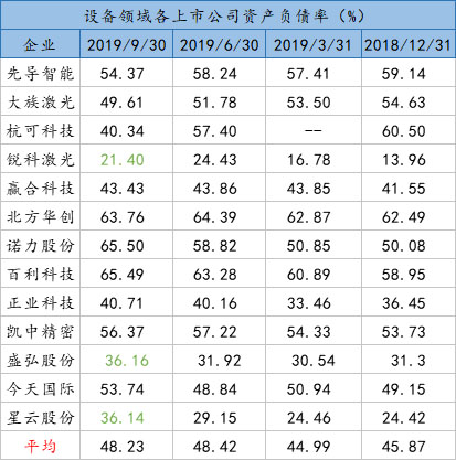 在設(shè)備領(lǐng)域,各企業(yè)相對比較保守,沒有一家企業(yè)資產(chǎn)負(fù)債率超過70%,有3家低于40%,最低只有21.4%,為科銳激光。
