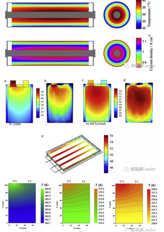 鋰離子電池按照結構和形狀主要可以分為三類:1)圓柱形;2)方形;3)軟包,不同的結構的電池在不同的方向上具有不同的散熱效率,例如對于圓柱形電池在直徑方向上由于隔膜等導熱效果較差的材料存在,因此電池內部溫度較高的位置主要集中的電芯的中間位置,而對于方形電池和軟包電池由于極耳位置的電流密度比較大,因此高溫區(qū)域也主要集中在電池靠近極耳的位置,而且靠近正極極耳的位置通常也會比靠近負極極耳位置的溫度更高。