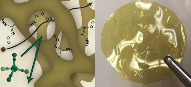 下圖(左):AquaPIM 由特種的聚合物制成,它能在高pH值的情況下變得離子化,生成可高度導(dǎo)電并具有高度選擇性的孔。下圖(右)這種材料可以被塑造成各種形狀,例如一種獨(dú)立式的膜。