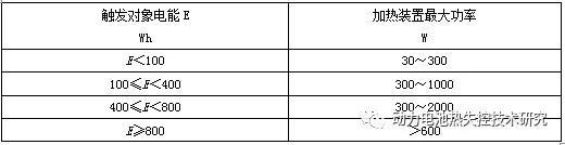 5.3.4 推薦的加熱觸發(fā)熱失控方法:使用平面狀或者棒狀加熱裝置,并且其表面應(yīng)覆蓋陶瓷、金屬或絕緣層。對(duì)于尺寸與電池單體相同的塊狀加熱裝置,可用該加熱裝置代替其中一個(gè)電池單體,與觸發(fā)對(duì)象的表面直接接觸;對(duì)于薄膜加熱裝置,則應(yīng)將其始終附著在觸發(fā)對(duì)象的表面;加熱裝置的加熱面積都應(yīng)不大于電池單體的表面積;將加熱裝置的加熱面與電池單體表面直接接觸,加熱裝置的位置應(yīng)與5.3.5中規(guī)定的溫度傳感器的位置相對(duì)應(yīng);安裝完成后,應(yīng)在24 h內(nèi)啟動(dòng)加熱裝置,以加熱裝置的最大功率對(duì)觸發(fā)對(duì)象進(jìn)行加熱;加熱裝置的功率要求見表2;當(dāng)發(fā)生熱失控或者5.3.5定義的監(jiān)測(cè)點(diǎn)溫度達(dá)到300 ℃時(shí),停止觸發(fā)。