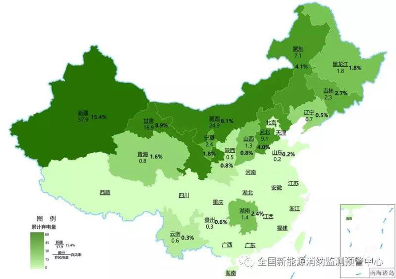 截至9月底各地區(qū)累計棄風電量(億千瓦時)及棄風率