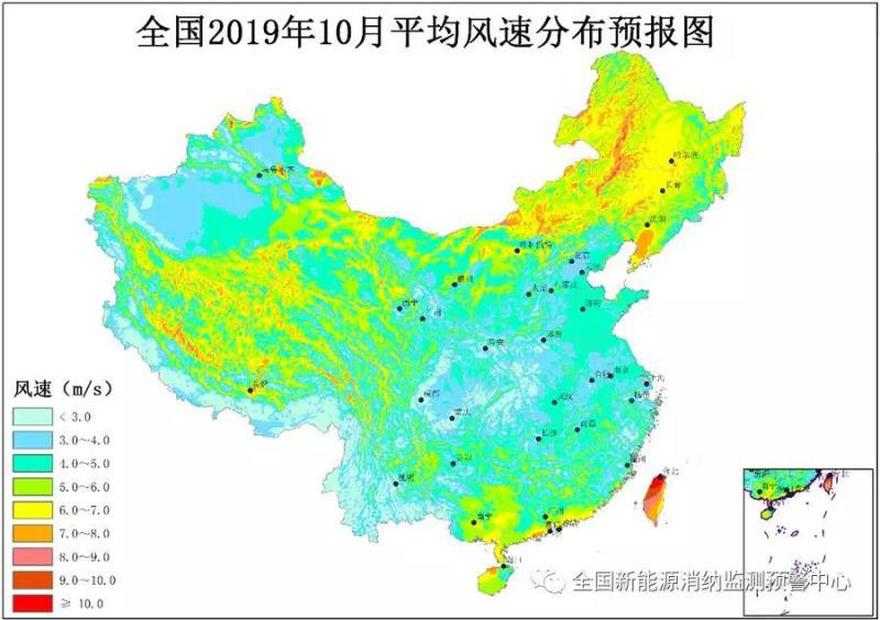 附圖1 全國2019年10月平均風速分布預報圖