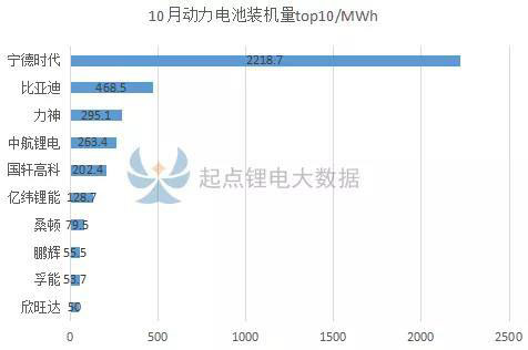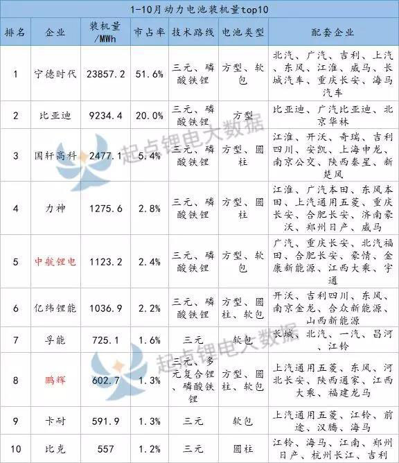 原標題:1-10月動力電池裝機量:中航鋰電第5、鵬輝進前十
