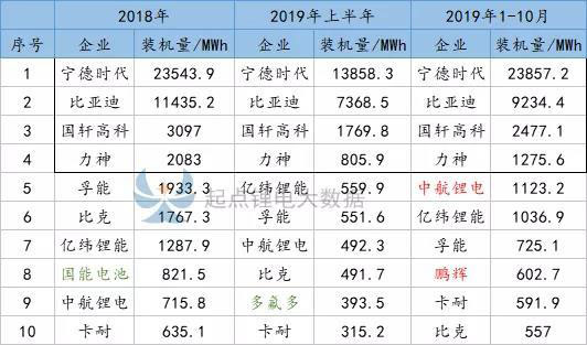起點鋰電大數(shù)據(jù)整理了2018年、2019年上半年、2019年1-10月裝機量排名前十的企業(yè)發(fā)現(xiàn),寧德時代、比亞迪、國軒高科龍頭前三的位置基本穩(wěn)固,力神排名第4位,但與第5位裝機量差距不大,前十榜里其他位次則存在較大變數(shù),比如2018年排名第8位的國能電池已然掉出前十,2019年上半年多氟多進入前十,2019年前十月,鵬輝能源進入前十,排名第8位。
