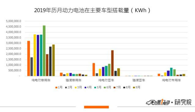 從車輛細分類別來看,2019年9月電動汽車裝機量主要來源于純電動乘用車,純電動客車裝機量略微回升。