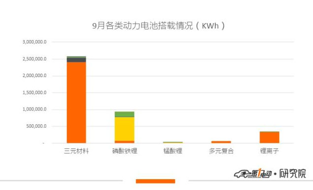 9月三元材料的搭載量為2.57GWh,其中乘用車占94%,三元材料搭載量占總搭載量的64.9%,與8月相比有所下降。磷酸鐵鋰電池隨著客車產(chǎn)量略微回升,裝機量提升至0.95GWh,在月度裝機中的占比也上漲至24%。錳酸鋰與多元復(fù)合電池9月合計裝機98.9MWh,占比2.5%。