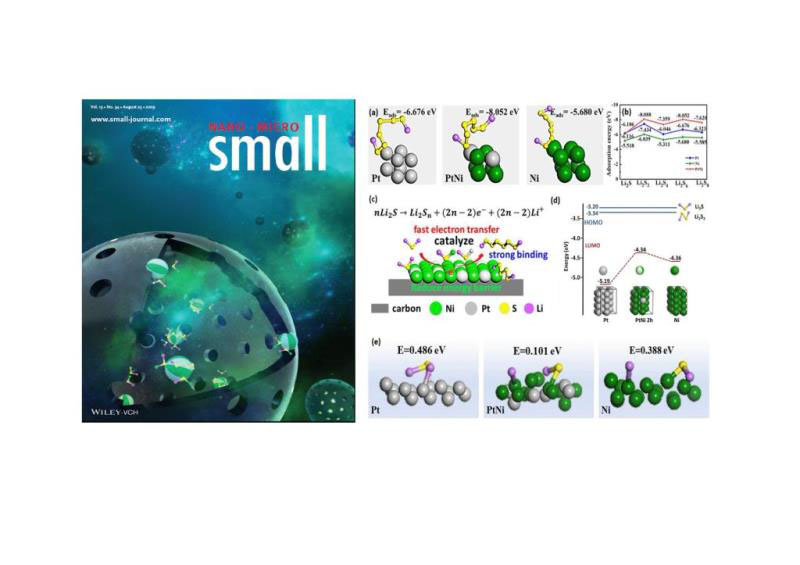 為提高膜電極內(nèi)電池內(nèi)動(dòng)力學(xué)反應(yīng)速率,在多孔空心碳球的限域反應(yīng)器中合成Pt@Ni核殼材料,雙金屬不僅通過(guò)降低反應(yīng)能壘,加速電子轉(zhuǎn)移從而促進(jìn)硫化鋰分解轉(zhuǎn)化,還增強(qiáng)了對(duì)多硫化物的親和吸附作用,實(shí)現(xiàn)了具有高容量和循環(huán)穩(wěn)定性的鋰硫電池。同時(shí)該研究還深入探究了雙金屬在鋰硫電池中的協(xié)同機(jī)理,并提供了相關(guān)的證明,為今后電催化在鋰硫電池中的應(yīng)用發(fā)展提供了借鑒,內(nèi)容以內(nèi)封面的形式發(fā)表(Small2019, 15, 1902431)。以上研究被邀請(qǐng)撰寫(xiě)關(guān)于電極材料制備及儲(chǔ)能領(lǐng)域的綜述性論文(Small2019, 15, 1804737)。