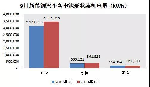 從9月新能源汽車各電池形狀裝機(jī)電量來(lái)看,方形電池裝機(jī)量3.44GWh,環(huán)比增長(zhǎng)10.29%;軟包電池裝機(jī)量0.36GWh,環(huán)比增長(zhǎng)1.71%;圓柱電池裝機(jī)量0.15GWh,環(huán)比下降8.76%。