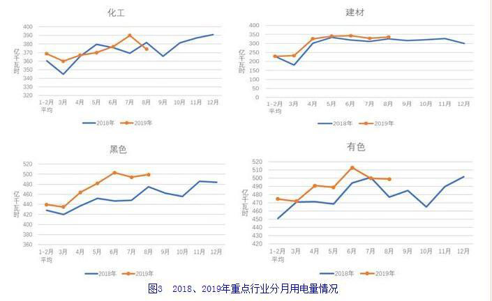 8月份,四大高載能行業(yè)用電量合計1708億千瓦時,同比增長2.0%,增速比上年同期回落5.4個百分點,占全社會用電量的比重為25.2%。其中,化工行業(yè)用電量374億千瓦時,同比下降2.0%,增速比上年同期回落5.2個百分點;建材行業(yè)用電量336億千瓦時,同比增長3.1%,增速比上年同期回落3.0個百分點;黑色金屬冶煉行業(yè)用電量499億千瓦時,同比增長4.9%,增速比上年同期回落9.1個百分點;有色金屬冶煉行業(yè)499億千瓦時,同比增長1.5%,增速比上年同期回落4.2個百分點。