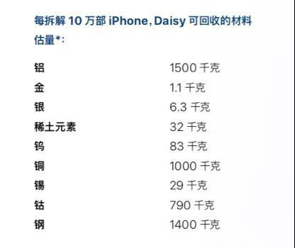 按照蘋(píng)果自己給出的表格(見(jiàn)下),100萬(wàn)臺(tái)手機(jī)僅鈷回收就有望達(dá)到7.9噸。另外,蘋(píng)果也表示已經(jīng)將Daisy回收的鈷返回上游產(chǎn)業(yè)鏈,用于制造全新的蘋(píng)果電池。