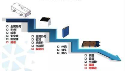 動(dòng)力電池經(jīng)使用后,電解液成糊狀,很難使用機(jī)器設(shè)備將電池內(nèi)芯完好的分離成正負(fù)極片和隔膜。回收企業(yè)一般會(huì)進(jìn)行電芯單體無(wú)害化處理,拆解破碎,篩選后得到正極粉、負(fù)極粉等。