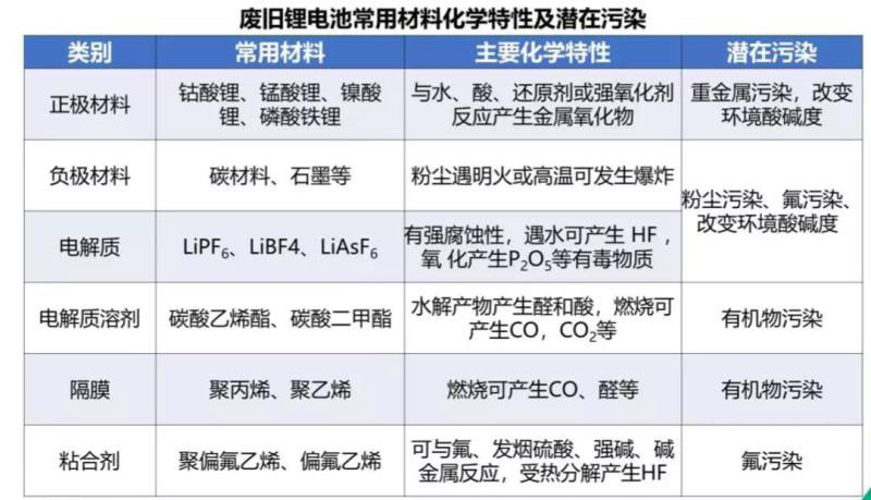 電池中的電解液溶質(zhì)六氟磷酸鋰(LiPF6)屬于有毒物質(zhì)且易潮解,受熱到60度時(shí)便會(huì)開(kāi)始分解成五氟化磷(PF5),而且LiPF6極易與空氣中的水分發(fā)生水解反應(yīng),產(chǎn)生氟化氫氣體(HF),PF5和HF均為劇毒氣體。另外,溶劑如果處理不好也會(huì)造成水污染。