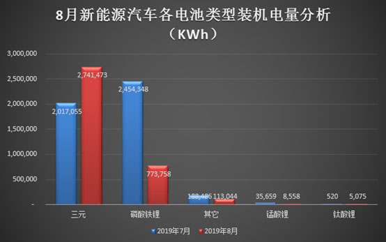 從8月各類型電池裝機(jī)量來看,受新能源乘用車裝機(jī)量大幅增長和新能源客車裝機(jī)電量大幅下滑影響,三元電池和磷酸鐵鋰電池的裝機(jī)情況也和7月相比出現(xiàn)了逆轉(zhuǎn)。