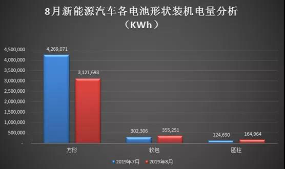 從8月各形狀電池裝機(jī)量來看,方形電池出現(xiàn)明顯環(huán)比下滑,軟包、圓柱環(huán)比裝機(jī)量呈現(xiàn)小幅回升態(tài)勢。