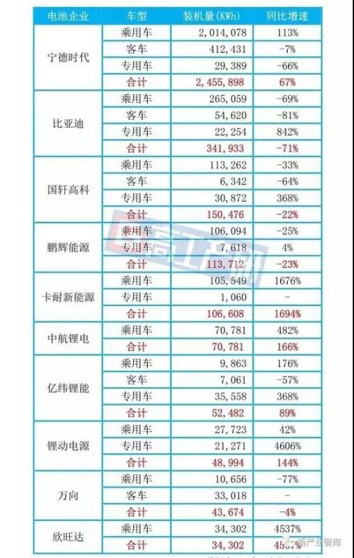 其中,比亞迪、國軒高科、億緯鋰能、鋰動(dòng)電源的新能源專用車裝機(jī)電量分別同比增長842%、368%、368%和4606%。