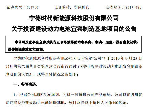 9月26日早間寧德時代發(fā)布公告表示,公司于2019年9月25日召開的第二屆董事會第八次會議審議通過了《關于投資建設動力電池宜賓制造基地項目的議案》,根據公司戰(zhàn)略發(fā)展規(guī)劃,為進一步推進公司電池產能布局,公司擬在四川省宜賓市投資建設動力電池制造基地,項目總投資不超過人民幣100億元。