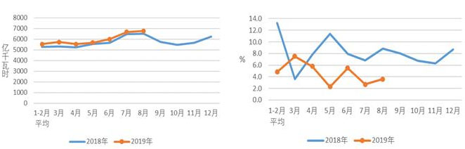 圖1 2018、2019年分月全社會(huì)用電量及其增速
