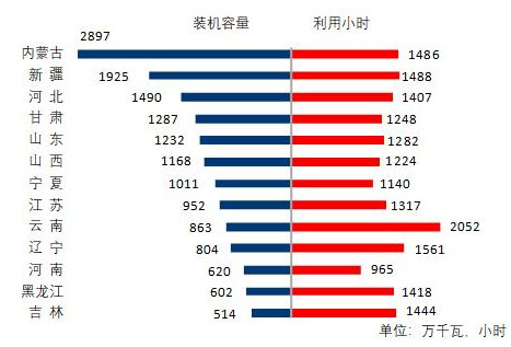 圖5 1-8月份風(fēng)電裝機(jī)較多省份風(fēng)電裝機(jī)容量和設(shè)備利用小時(shí)