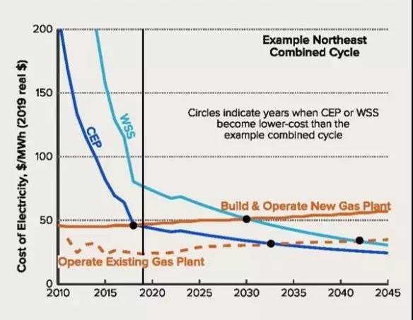 隨著太陽(yáng)能光伏和電池儲(chǔ)能成本的下降,一個(gè)新興的解決方案是太陽(yáng)能+儲(chǔ)能。由于稅收抵免降低了這兩種技術(shù)的成本,使其與天然氣價(jià)格持平,光伏儲(chǔ)能技術(shù)的經(jīng)濟(jì)前景在當(dāng)前尤其誘人。正如落基山研究所(RMI)在2019年的報(bào)告《日益增長(zhǎng)的清潔能源投資市場(chǎng)》(the Growing Market for Clean energy portfolio)中所報(bào)告的那樣,“清潔能源投資組合(CEP),即風(fēng)能、太陽(yáng)能、儲(chǔ)能和需求側(cè)管理的優(yōu)化組合,目前在成本上與新的燃?xì)獍l(fā)電廠相近,能夠可靠地滿足電網(wǎng)需求”。