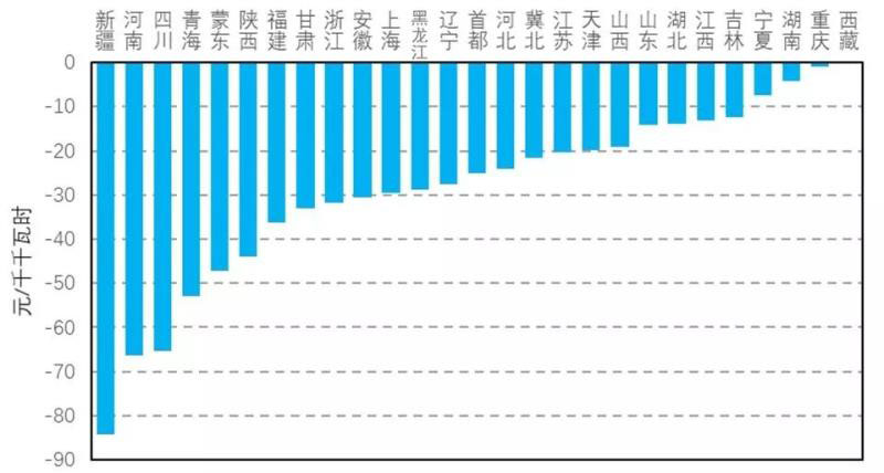 圖2 2018年各省交易電價(jià)較標(biāo)桿電價(jià)降幅排序(單位:元/千千瓦時(shí))