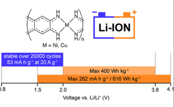 最近,斯科爾科沃科技學(xué)院與俄羅斯化學(xué)物理問題研究所的一組由P. Troshin教授領(lǐng)導(dǎo)的科學(xué)家和德國(guó)科隆大學(xué)以及俄羅斯烏拉爾聯(lián)邦大學(xué)合作,專注于研究基于四氨基苯的鎳和銅線性聚合物。雖然該線性聚合物與二維競(jìng)品相比,表現(xiàn)出更低的初始電子導(dǎo)電率,但是能夠作為陽(yáng)極材料,在不到一分鐘的時(shí)間內(nèi)完成充放電,因?yàn)閾诫s了鋰,在第一次放電后,其導(dǎo)電率會(huì)急劇增加。