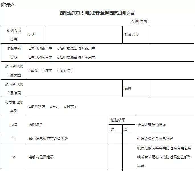 回收服務(wù)網(wǎng)點(diǎn)應(yīng)根據(jù)廢舊動(dòng)力蓄電池的材料類別、危險(xiǎn)程度等特性,按照附錄 A 或國家有關(guān)標(biāo)準(zhǔn)規(guī)定的檢測(cè)項(xiàng)目,對(duì)廢舊動(dòng)力蓄電池進(jìn)行分類管理。
