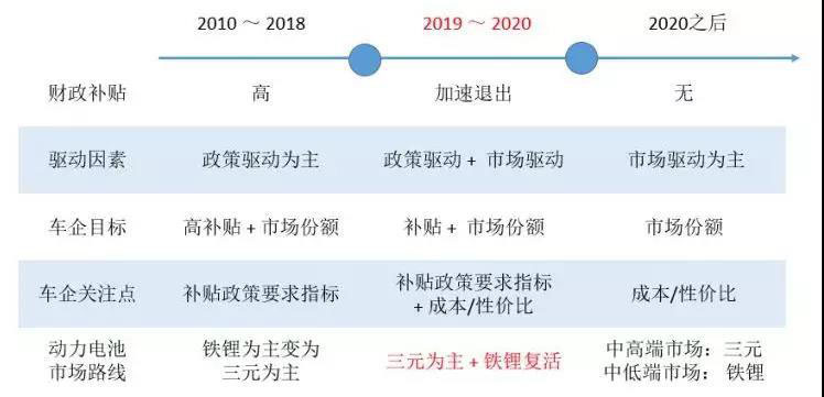 現(xiàn)階段,鐵鋰技術(shù)路線又迎來了發(fā)展的機(jī)遇,原因有三:第一,鐵鋰的技術(shù)大升級,能量密度大幅提高,減小了和三元路線的差距,彌補(bǔ)短板。第二,2018年新能源車安全事故時(shí)有發(fā)生,鐵鋰路線的低成本、高安全性優(yōu)勢更受重視。第三、政府重新引導(dǎo),2019年補(bǔ)貼大幅退坡,并且2020年后無補(bǔ)貼,新能源車行業(yè)發(fā)展回歸市場。