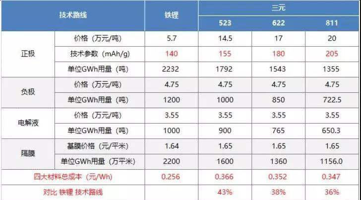 第二:隨著三元電池技術(shù)路線升級,從523升級到622,再從622升級到811,單位Wh動(dòng)力電池使用的負(fù)極、隔膜和電解液用量都相應(yīng)減少15%。目前鐵鋰的四大材料總成本是0.26元/Wh,而三元的四大材料成本比鐵鋰的至少高35%。磷酸鐵鋰技術(shù)路線相對于三元技術(shù)路線有明顯的成本優(yōu)勢。