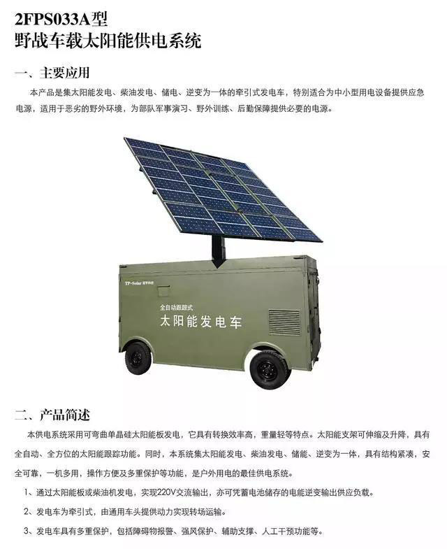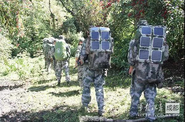 2.最普遍的方式-光伏發(fā)電設備。 清潔能源中,光伏發(fā)電是大規(guī)模使用的一種。因設備簡單可靠,對環(huán)境要求低(有太陽就行),光伏發(fā)電被各國軍隊采用。我軍也有類似設備,如這款粘有6塊黑色單晶電池片的迷彩帆布,折疊后長寬18厘米,厚度不超過3厘米,天晴時將其掛在單兵背囊上就可為裝備供電,額定功率達到20W,可以滿足電臺、“北斗一號”手持型用戶機等裝備的用電需求。