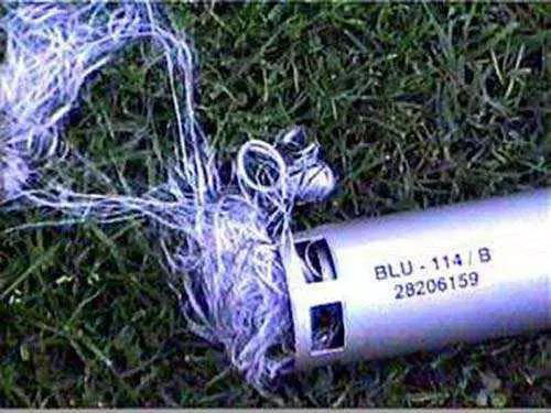 正是因為軍事行動、武器裝備對電力高度依賴,摧毀敵方供電設施也成為削弱對方戰(zhàn)斗力的主要手段之一。石墨炸彈又稱“電力殺手”,海灣戰(zhàn)爭首次登場便摧毀了伊拉克85%的供電系統(tǒng);1999年,北約空襲南聯(lián)盟,使用F-117A隱形戰(zhàn)斗機投擲BLU-114/B石墨炸彈,僅一天就讓南聯(lián)盟全國70%地區(qū)停電。石墨炸彈原理并不復雜,但對精度要求較高,破壞性極大。炸彈內部裝有100-200個易拉罐大小的容器,容器釋放后打開頂部的小降落傘,減速下降并保持垂直。