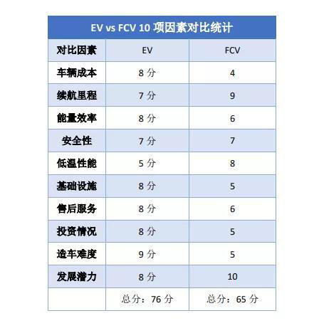 將純電動汽車和燃料電池汽車10項因素的對比整理在一個表格中,具體如下。