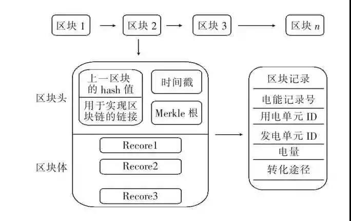區(qū)塊鏈是一串使用密碼學方法相關(guān)聯(lián)產(chǎn)生的數(shù)據(jù)塊,每一個數(shù)據(jù)塊中都包含一次發(fā)用電的所有相關(guān)信息。該類信息不以交易的原始數(shù)據(jù)形式進行保存,而是利用hash 算法將數(shù)據(jù)轉(zhuǎn)化為固定長度的二進制形式的hash 值,并由區(qū)塊鏈系統(tǒng)采用Merkle 樹對這些信息進行歸納表示。當一次電能轉(zhuǎn)化確實發(fā)生后,區(qū)塊鏈系統(tǒng)還會為其蓋上正確的時間戳,表明該電能量區(qū)塊所屬權(quán)已發(fā)生轉(zhuǎn)移,自動避免重復需求情況的發(fā)生[4,11]。區(qū)塊鏈的該算法流程既可用于驗證其發(fā)用電信息的有效性,同時還可生成下一個區(qū)塊,單個區(qū)塊的數(shù)據(jù)結(jié)構(gòu)如圖2 所示。