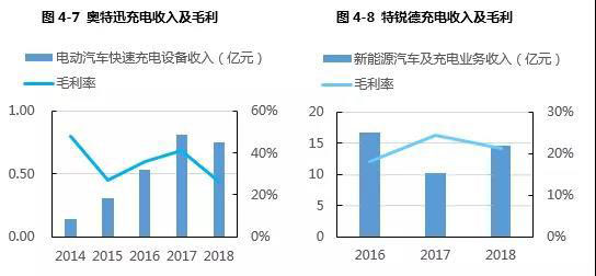 以奧特迅和特銳德2家運(yùn)營商的充電業(yè)務(wù)經(jīng)營情況為例,2014-2018年我國電動(dòng)汽車充電樁運(yùn)營商充電營業(yè)收入呈現(xiàn)出波動(dòng)上升的局面,這是由于市場競爭大,行業(yè)受宏觀政策影響較大。此外,特銳德毛利率維持在20%左右,而奧特迅毛利率較高,但在2018年兩家公司毛利率均呈現(xiàn)下降趨勢。