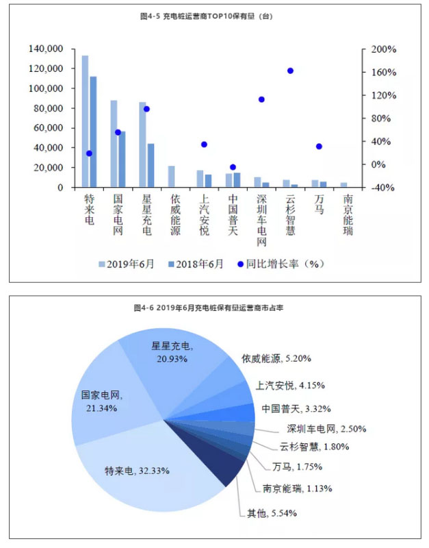 集中度:充電運(yùn)營環(huán)節(jié)集中度高。截止2019年6月,特來電、國家電網(wǎng)和星星充電分別以13.31萬臺(tái)、8.78萬臺(tái)和8.62萬臺(tái)的保有量位居前三甲,三家市占率之和高達(dá)74.6%。