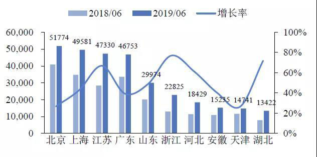 公共樁主要集中在東部沿海地區(qū),截至2019年6月,公共充電樁保有量排名前5的省份為北京、上海、江蘇、廣東、山東。公共充電樁建設(shè)區(qū)域較為集中,前10省份的公共樁占比達(dá)75.3%,保有量超過31萬,且普遍分布于直轄市和東部沿海發(fā)達(dá)省份,新疆、寧夏和青海等西部省份與吉林省全省僅有數(shù)百個(gè)公共樁。從公共充電樁數(shù)量增加速度來看,浙江、湖北、江蘇三省充電樁布局速度快,分別較2018年6月增加9916臺(tái)、5610臺(tái)、18952臺(tái),增長率位居前三甲,分別為76.8%、71.8%、66.8%。