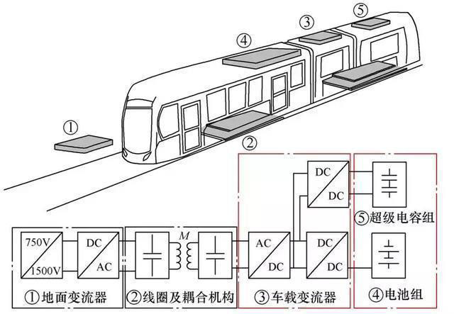 在車載儲(chǔ)能系統(tǒng)中,電池/超級(jí)電容混合儲(chǔ)能系統(tǒng)(Hybrid Energy Storage System, HESS)由于兼具高能量和高功率密度的優(yōu)點(diǎn),引起了人們的關(guān)注。本文考慮混合儲(chǔ)能系統(tǒng)作為無(wú)線電能傳輸系統(tǒng)的用電負(fù)載,以有軌電車為例給出了充電拓?fù)洌鐖D1所示。
