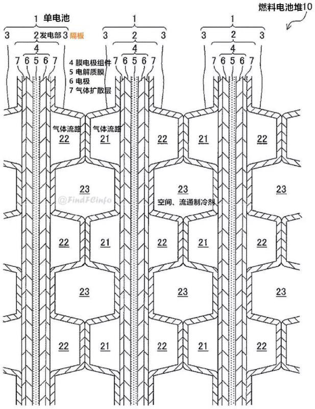 另一方面,CN109962256A還公開了由該隔板制成的燃料電池堆,在燃料電池堆中,層疊有多個(gè)作為基本單元的單電池,單電池具備發(fā)電部(發(fā)電部由膜電極組件和配置于其兩面的氣體擴(kuò)散層一體化制得)和與發(fā)電部接觸的隔板(示意圖中發(fā)電部被一對(duì)隔板所夾持)。在相鄰兩個(gè)單電池間面接觸的隔板之間劃分成的空間,流通作為將單電池冷卻的制冷劑的水。