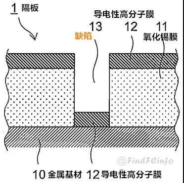 該隔板具有金屬基材、設(shè)置于金屬基材表面的氧化錫膜以及設(shè)置在氧化錫膜缺陷處露出的金屬基材表面上的導(dǎo)電性高分子膜;該導(dǎo)電性高分子膜含有聚乙撐二氧噻吩(PEDOT)。如上圖所示,在氧化錫膜上通常會(huì)形成有缺陷13(如直徑1-5nm的微細(xì)的孔),通過在該缺陷處露出的金屬基材表面上覆上導(dǎo)電性分子膜,能夠減少Fe2+等的溶出、抑制金屬基材的腐蝕。作為構(gòu)成導(dǎo)電性高分子膜,只要是具有相對(duì)高的導(dǎo)電性、包覆金屬基材的表面從而能夠減少Fe等金屬溶出的材料就行。導(dǎo)電性高分子膜的膜厚雖然取決于構(gòu)成其材料的類型,但是其膜厚優(yōu)選在1nm~5nm的范圍內(nèi)。