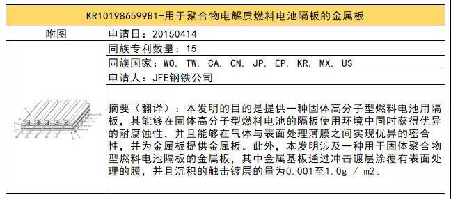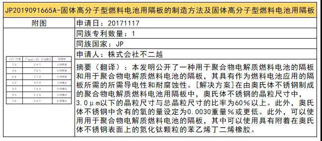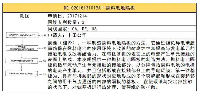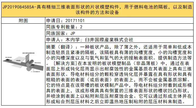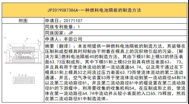 下文分析的豐田公司雙極板/隔板相關(guān)專利的公開號(hào)為:CN109962256A、CN109950567A、EP3503251A1、US10316422B2、CN109943846A。