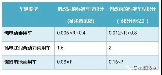 征求意見稿中下調了單車積分。在征求意見稿提出的新能源汽車車型積分計算方法中,同樣里程的純電動乘用車所獲的積分比以前的《積分辦法》下降,弱化了續(xù)航里程對新能源汽車車型積分的影響。純電動乘用車和燃料電池乘用車的單車積分直接減半,插電式混合動力乘用車單車積分由原來的2分降低為1.6分。純電動乘用車標準車型積分上限亦由原來的5分,降低為3.4分。