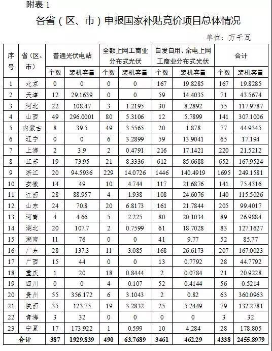 這次申報(bào)項(xiàng)目中已并網(wǎng)項(xiàng)目容量121.9311萬(wàn)千瓦,新建項(xiàng)目容量2333.9664萬(wàn)千瓦。新疆、甘肅和新疆建設(shè)兵團(tuán)因市場(chǎng)環(huán)境監(jiān)測(cè)為紅色,不能申報(bào)光伏發(fā)電補(bǔ)貼競(jìng)價(jià)項(xiàng)目;西藏光伏發(fā)電單獨(dú)進(jìn)行建設(shè)管理,不用申報(bào);還有個(gè)別省因電網(wǎng)消納能力有限,在統(tǒng)籌考慮風(fēng)電和光伏發(fā)電平價(jià)項(xiàng)目的情況下,沒有組織項(xiàng)目參與補(bǔ)貼競(jìng)價(jià);也有個(gè)別省份受限于電網(wǎng)消納能力,申報(bào)規(guī)模較少。申報(bào)項(xiàng)目總體情況詳見附表1。
