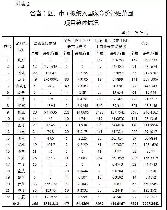 這次擬納入國(guó)家競(jìng)價(jià)補(bǔ)貼項(xiàng)目,已并網(wǎng)項(xiàng)目容量86.4569萬(wàn)千瓦,新建項(xiàng)目容量2192.4073萬(wàn)千瓦。納入競(jìng)價(jià)補(bǔ)貼范圍項(xiàng)目總體情況詳見附表2。