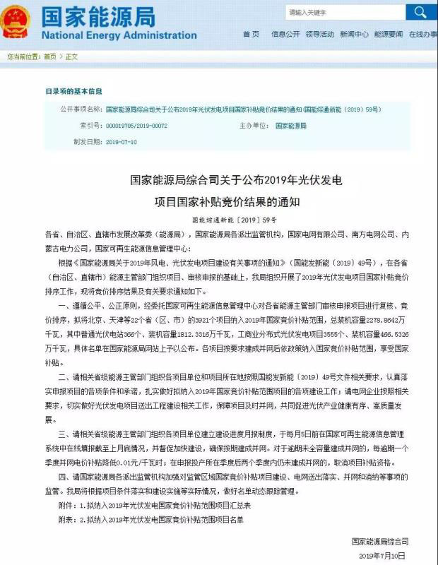 2019年5月,國(guó)家能源局發(fā)布了《關(guān)于2019年風(fēng)電、光伏發(fā)電項(xiàng)目建設(shè)有關(guān)事項(xiàng)的通知》(國(guó)能發(fā)新能〔2019〕49號(hào),以下簡(jiǎn)稱《通知》),啟動(dòng)了2019年光伏發(fā)電國(guó)家補(bǔ)貼競(jìng)價(jià)項(xiàng)目申報(bào)工作。7月1日各省完成補(bǔ)貼競(jìng)價(jià)項(xiàng)目申報(bào)工作后,按國(guó)家能源局要求,國(guó)家可再生能源信息管理中心(以下簡(jiǎn)稱信息中心)依托光伏發(fā)電國(guó)家補(bǔ)貼競(jìng)價(jià)信息系統(tǒng),對(duì)申報(bào)項(xiàng)目進(jìn)行了復(fù)核和競(jìng)價(jià)排序。7月11日,國(guó)家能源局正式公布了2019年光伏發(fā)電項(xiàng)目國(guó)家補(bǔ)貼競(jìng)價(jià)結(jié)果。