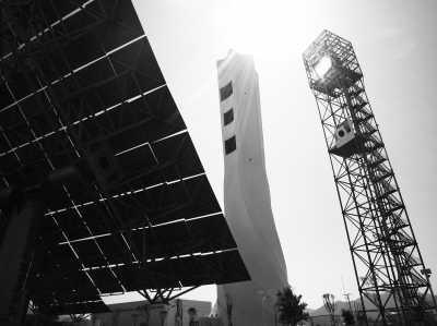 一進(jìn)入電站,記者首先被眼前一個(gè)造型優(yōu)雅的龐然大物所吸引,這是個(gè)白色的六邊形柱體,朝北一側(cè)靠近頂端的位置留有三個(gè)“窗口”。“這叫太陽(yáng)塔,也叫集熱塔,它高120米,那三個(gè)窗口將用來(lái)安裝集熱器。”電站站長(zhǎng)馬廣成告訴記者,“之所以留三個(gè)窗口,是因?yàn)槲覀冸娬臼菍?shí)驗(yàn)電站,可以通過(guò)裝不同的集熱器,以測(cè)試其性能特點(diǎn),從而選擇更適合的集熱器技術(shù)。”