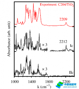他們進(jìn)一步研究了不含金屬的純有機(jī)分子在TiO2界面上的原子結(jié)構(gòu)對(duì)形成的有機(jī)染料太陽(yáng)能電池效率的影響。這類分子一般采納Donor-π-Acceptor的結(jié)構(gòu),大多通過氰基丙烯(cyanoacrylic) 基團(tuán)與表面結(jié)合。雖然這一類分子得到極為廣泛的應(yīng)用,但其吸附結(jié)構(gòu)并不清楚。此前人們普遍認(rèn)為這一類有機(jī)染料與傳統(tǒng)釕復(fù)合物染料類似,只通過羧基吸附在TiO2表面。基于第一性原理分子動(dòng)力學(xué)和含時(shí)密度泛函理論計(jì)算,焦揚(yáng)等與瑞士聯(lián)邦理工Michael Graetzel教授合作研究了含氰基丙烯基團(tuán)的有機(jī)分子在銳鈦礦TiO2(101)表面的吸附和電子動(dòng)力學(xué)(圖1)。通過對(duì)動(dòng)力學(xué)模擬得到的振動(dòng)譜的詳細(xì)分析和與實(shí)驗(yàn)得到的紅外吸收譜的比較(圖2),他們發(fā)現(xiàn)氰基和羧基共同參與表面吸附,該吸附構(gòu)型非常有利于太陽(yáng)能源轉(zhuǎn)化。